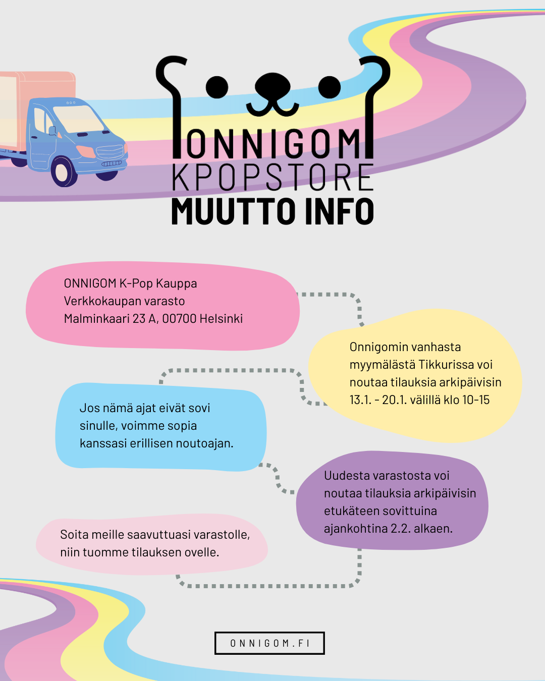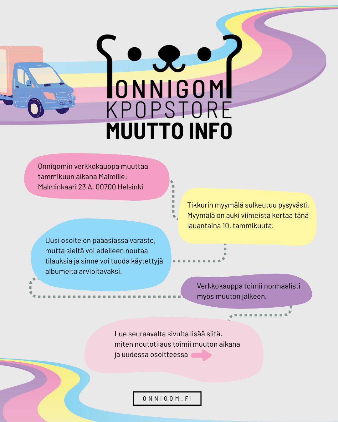 Onnigomin verkkokauppa muuttaa tammikuun aikana Malmiin! ʕ•ᴥ•ʔノ♡